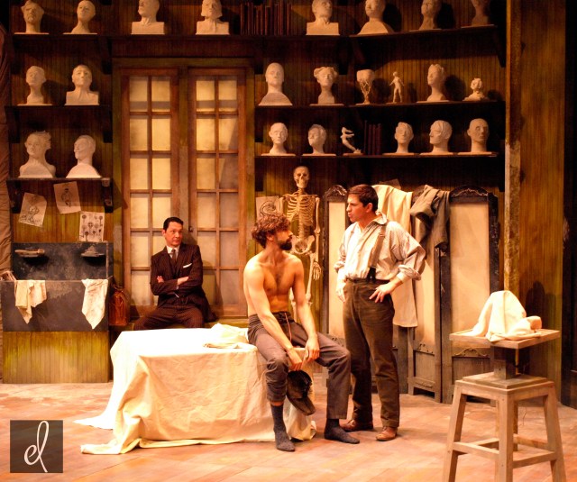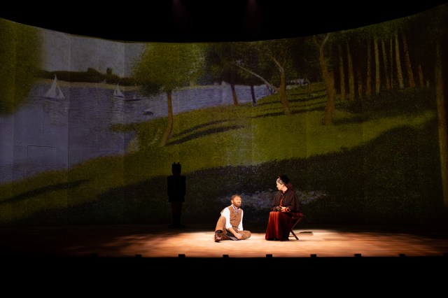 “The production’s design team — including scenic designer Gary C. Hoff and media designer Michaela Lochen — easily draws us into the artist’s world, conjuring the layered landscape of La Grande Jatte, just as it might have first taken shape in Seurat’s notebook. A huge, curved wall offers a blank canvas for Lochen’s marvelously detailed projections, and a translucent scrim serves as Seurat’s canvas. Darren E. Levin’s lighting is stunning, whether capturing the hot summer sun or the dappled light of Seurat’s studio, and Melissa K. Durmon’s whimsical costumes add another beautiful touch..”